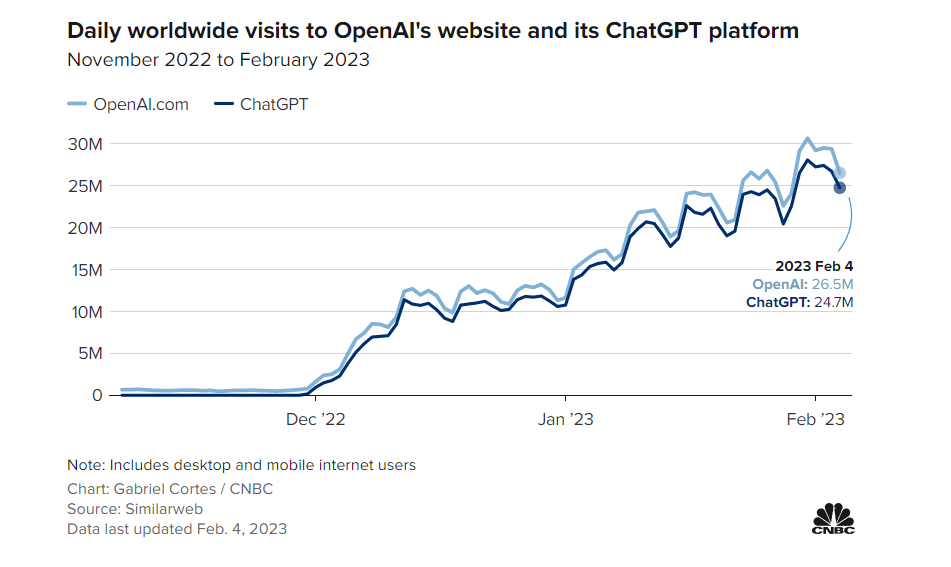 Deri në janar, ChatGPT kishte grumbulluar 100 milionë përdorues aktivë mujorë vetëm dy muaj pas fillimit të tij, duke e bërë atë aplikacionin e konsumatorit me rritjen më të shpejtë në histori, sipas një shënimi të UBS të publikuar javën e kaluar.