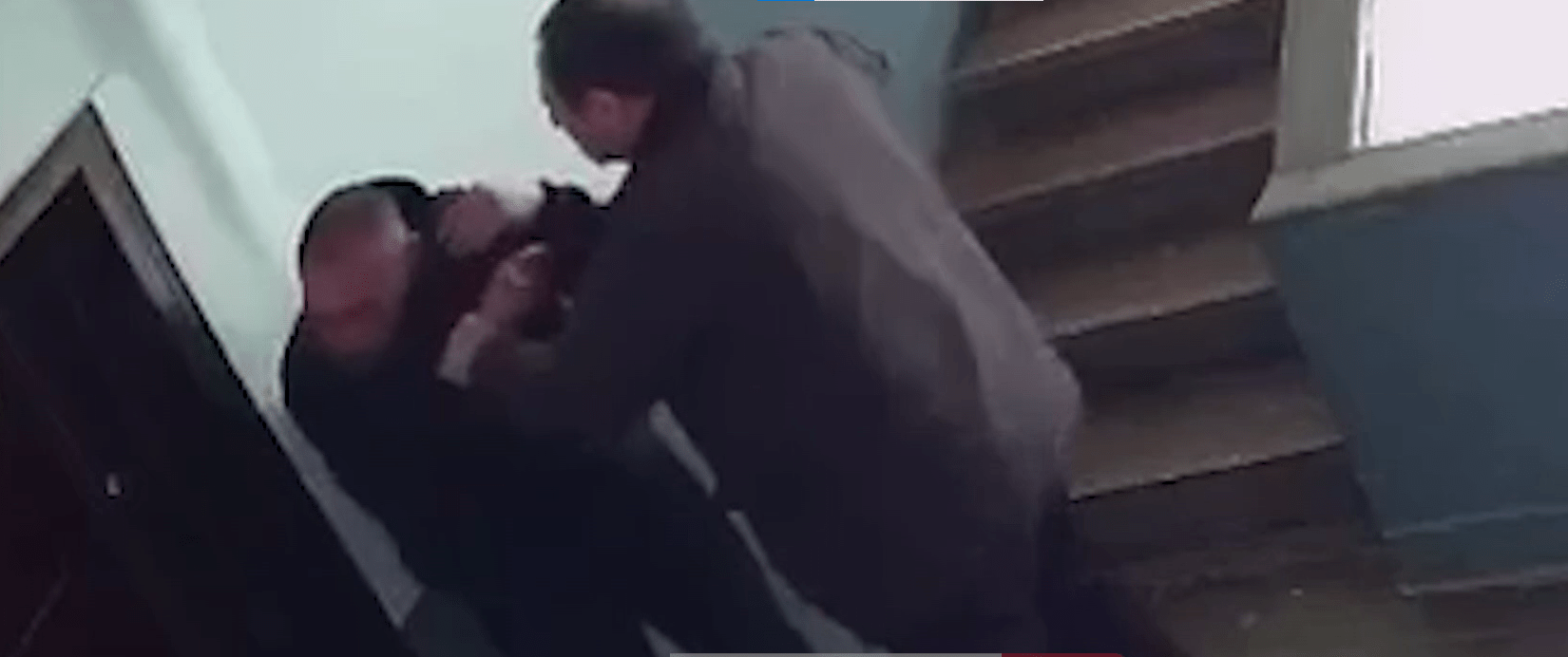 Riza për arsye që ende nuk dihen, nga pamjet duket që e godet të riun disa herë me shpulla e shkelma dhe e kap për fyti.