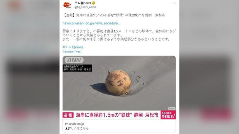 Një top misterioz i gjetur në një plazh në një qytet japonez ka bërë që policia të rrethojë zonën. Ata janë të shqetësuar se objekti mund të jetë një lloj mine detare, sipas mediave lokale.