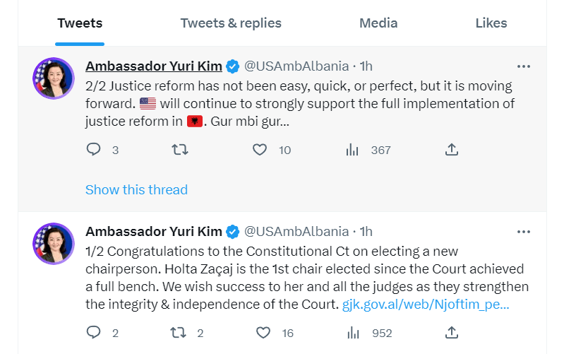 “Urime Gjykatës Kushtetuese për zgjedhjen e kryetarit të ri. Holta Zaçaj është kryetarja e parë që zgjidhet që kur Gjykata u plotësua. I urojmë suksese asaj dhe të gjithë gjyqtarëve duke forcuar integritetin dhe pavarësinë e Gjykatës. Reforma në drejtësi nuk ka qenë e lehtë, e shpejtë apo e përsosur, por po ecën përpara. Amerika do të vazhdojë të mbështesë fuqishëm zbatimin e plotë të reformës në drejtësi në Shqipëri. Gur pas guri…”, shkruan ambasadorja Yuri Kim.