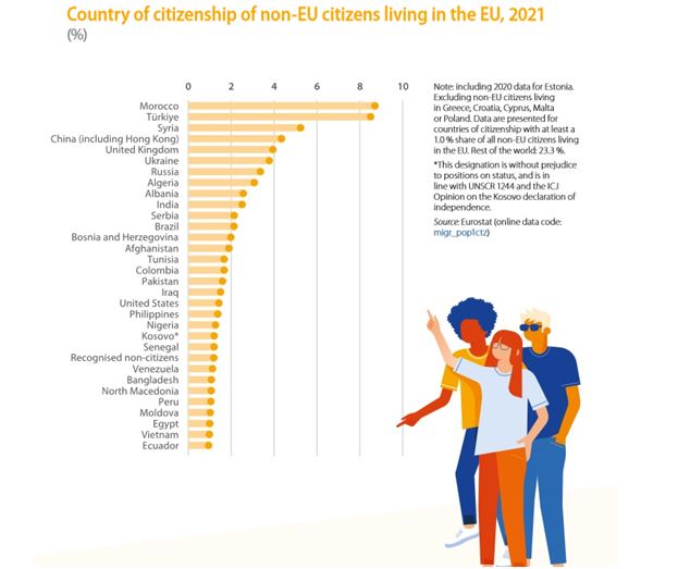 Sipas Eurostat, në fillim të vitit 2021, në BE banonin 23.7 milionë njerëz që nuk ishin shtetas të një shteti anëtar. Kjo ishte e barabartë me 5.3% të popullsisë së BE-së. 31 shtetësi jashtë BE-së kishin të paktën 1.0% të të gjithë shtetasve jo-BE që jetonin në BE, ashtu si edhe joshtetasit e njohur.