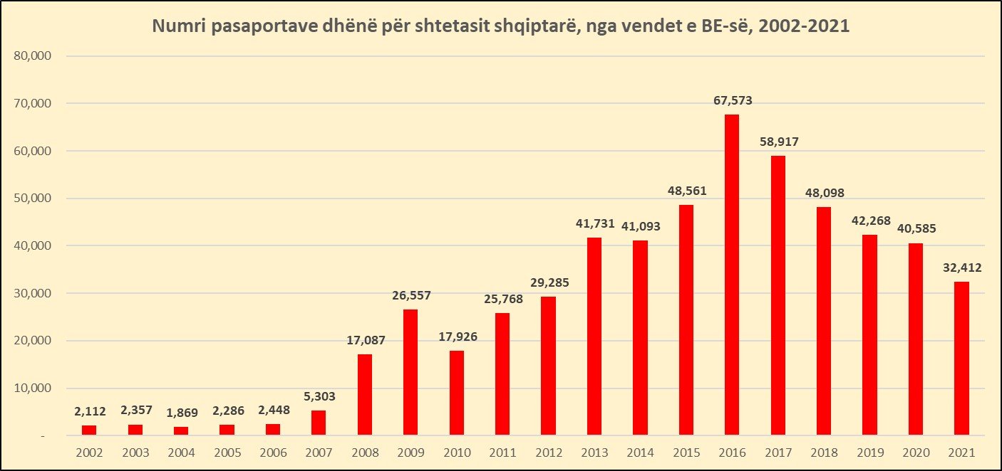 Vetëm në vitin 2021 u dhanë 32 mijë nënshtetësi, duke u renditur të tretët pas Marokut dhe Sirisë. Ndërsa në krahasim me një vit më parë, shifra ka shënuar një rënie prej 20%. (shiko grafikun: Numri pasaportave dhënë për shtetasit shqiptarë, nga vendet e BE-së, 2002-2021).