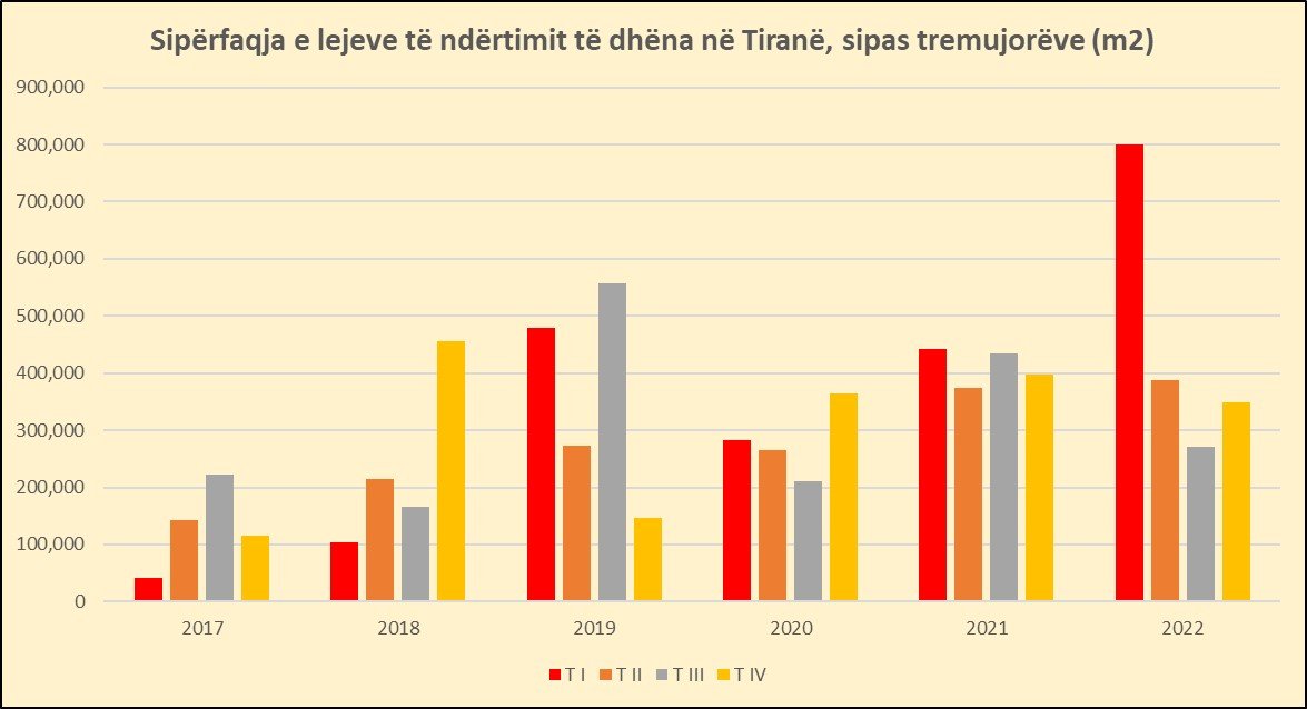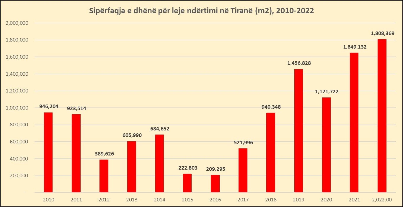 Sipas Statistikave të INSTAT, në vitin 2022 u dhanë gjithsej nga Bashkia e Tiranës leje ndërtimi me sipërfaqe prej rreth 1.81 milionë metra katror. Në krahasim me një vit më parë, ky tregues u rrit me rreth 10%, ndërsa ka shënuar nivelin më të lartë historik, të paktën që nga viti 2005, kur INSTAT i raporton të dhënat ë detajuara sipas qarqeve.