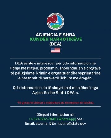 Agjencia e SHBA Kundër Narkotikëve njofton një linjë të re sinjalizimi për Shqipërinë. DEA nxit këdo që ka informacion në lidhje me trafikun e drogës ose pastrimin e të ardhurave nga droga ta ndajë informacionin me personelin e DEA-s në WhatsApp në: +1 571 502-7846 ose me email në: albania_DEA_tipline@state.gov. Të gjitha të dhënat do të mbahen të fshehta. Shtetet e Bashkuara janë të përkushtuara të punojnë me Shqipërinë për të luftuar trafikun e drogës dhe pastrimin e parave të lidhura me to, për një të ardhme më të mirë për të gjithë shqiptarët.