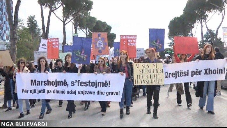 Me pankartat në duar, ‘S’duam lule, duam të drejtat’, ‘Ti ke lindur nga një grua’ ‘Beso te vetja’, ‘Bota jemi ne’. Në sy binte edhe pankarta me mbishkrimin ‘Drejtësi për Joyn’ 22 vjeçaren Keniane që u dhunua barbarisht në Shqipëri dhe gjeti vdekjen.