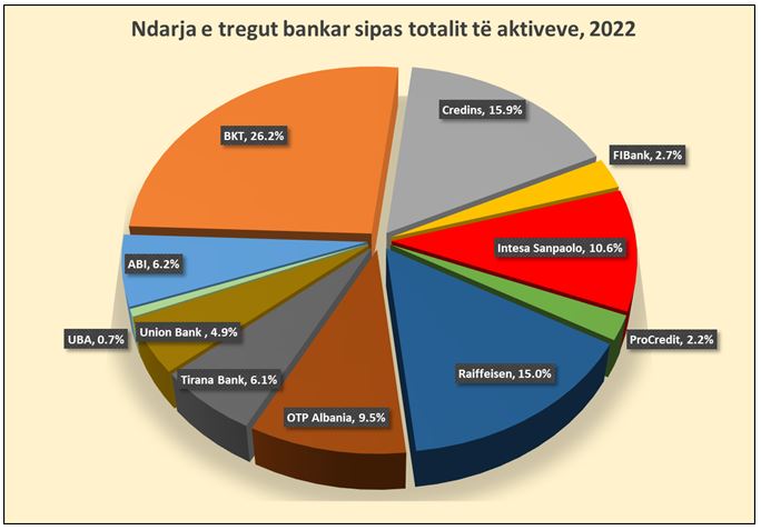 Pjesa e Raiffeisen Bank pësoi rënie në 15%, nga 15.3% që kishte qenë në fund të vitit 2021. Ndërsa pjesa e Intesa Sanpaolo Shqipëria ra më tej në 10.6%, nga 11.3% që kishte qenë një vit më parë. Përjashtim bëri banka më e vogël, ProCredit Bank Shqipëri, që shënoi një rritje të lehtë të peshës së tregut në 2.2%, nga 2.1% që mbante në vitin 2021.