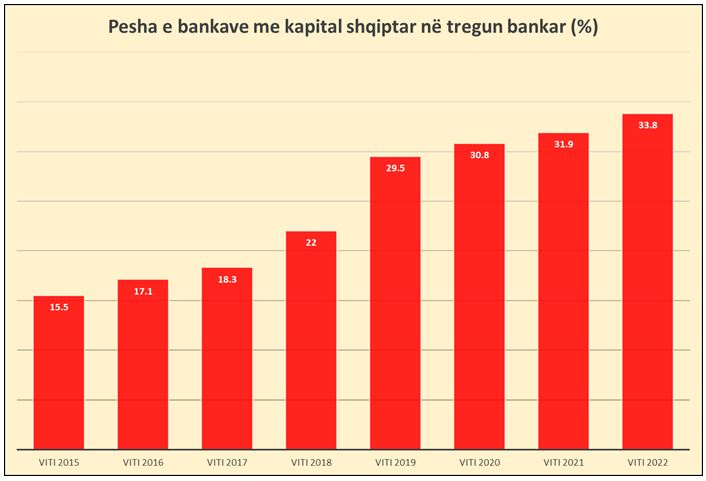 Statistikat e Shoqatës Shqiptare të Bankave tregojnë se në fund të vitit 2022 bankat me kapital vendas zotëronin 33.8% të aktiveve totale të sektorit bankar në vend.