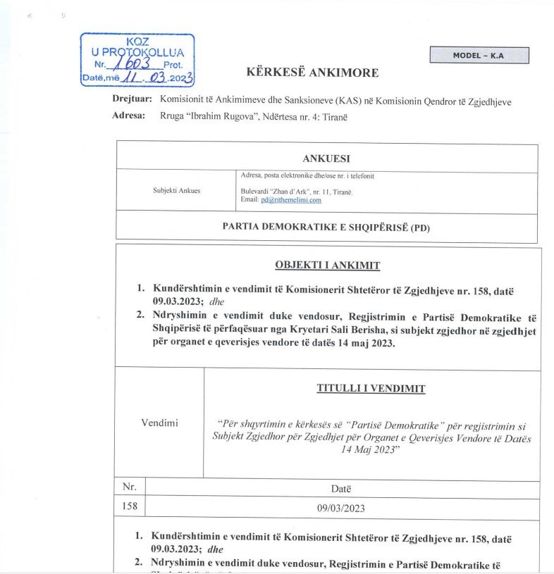 Partia Demokratike e drejtuar nga Sali Berisha ka ankimuar në KAS vendimin e KQZ-së për të mos e regjistruar në zgjedhjet e 14 majit.