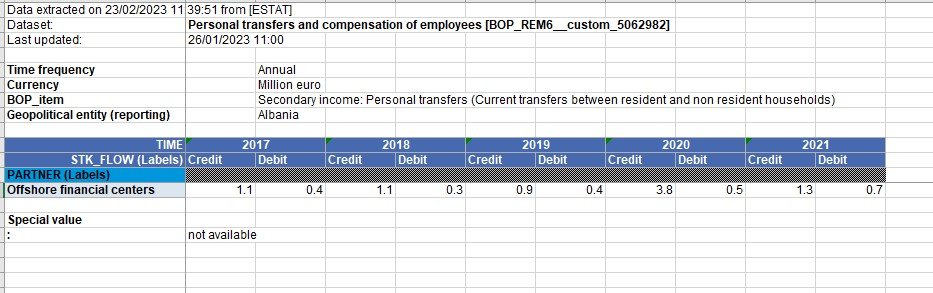 Eurostat në fakt raporton vetëm transfertat personale që bëhen drejt dhe nga vendet offshore, por rritja e shifrave vitet e fundit tregon se ky mekanizëm po përdoret gjithnjë e më shumë. Maqedonia Veriut, psh i ka zero transfertat personale në hyrje e dalje nga vendet offshore, ndërsa ato përdoren në Serbi dhe shumë pak në Mal të Zi.