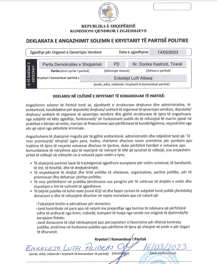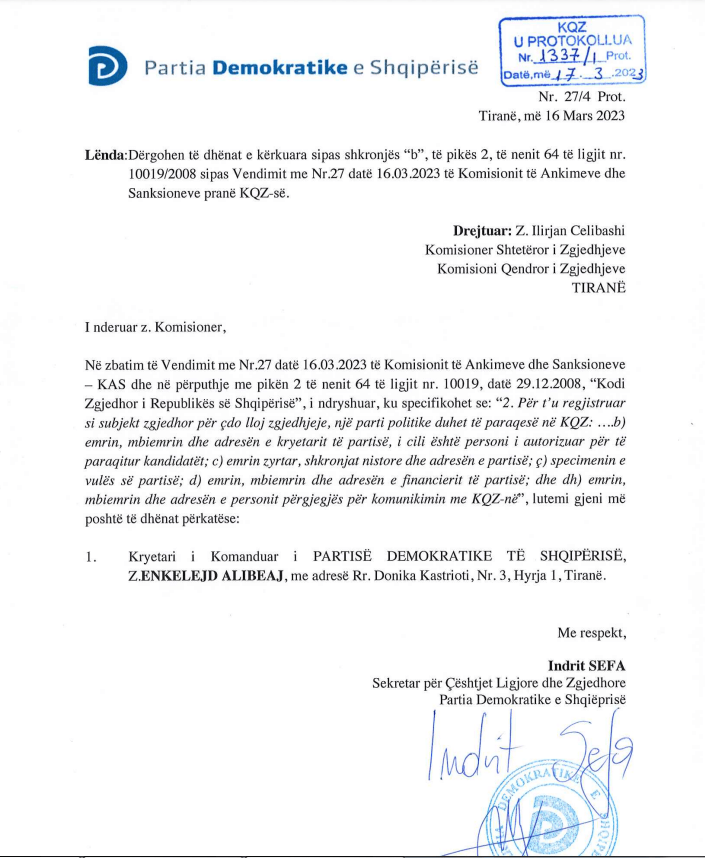 Pas vendimit të Komisionit të Ankesave dhe Sanksioneve për të regjistruar PD-në zyrtare në zgjedhjet e 14 majit, Enkelejd Alibeaj ka dorëzuar në KQZ deklaratën solemne të firmosur si Kryetar i Komanduar.