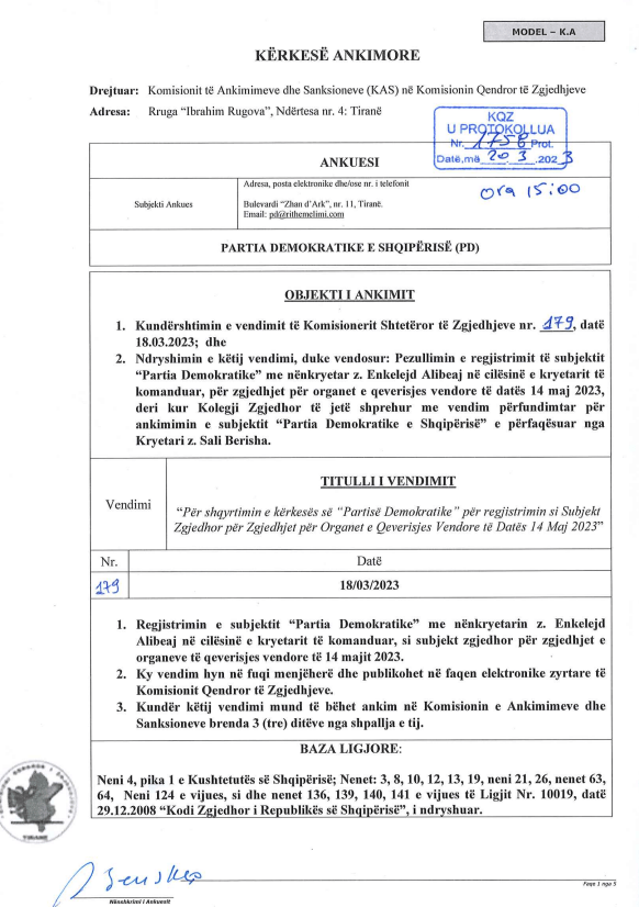 Nga vendimi i Komisionit Qendror të Zgjedhjeve për të regjistruar PD me kryetar të komanduar Enkelejd Alibeaj për zgjedhjet lokale të 14 majit, ish kryeministri Sali Berisha ka vendosur ta ankimojë këtë vendim.