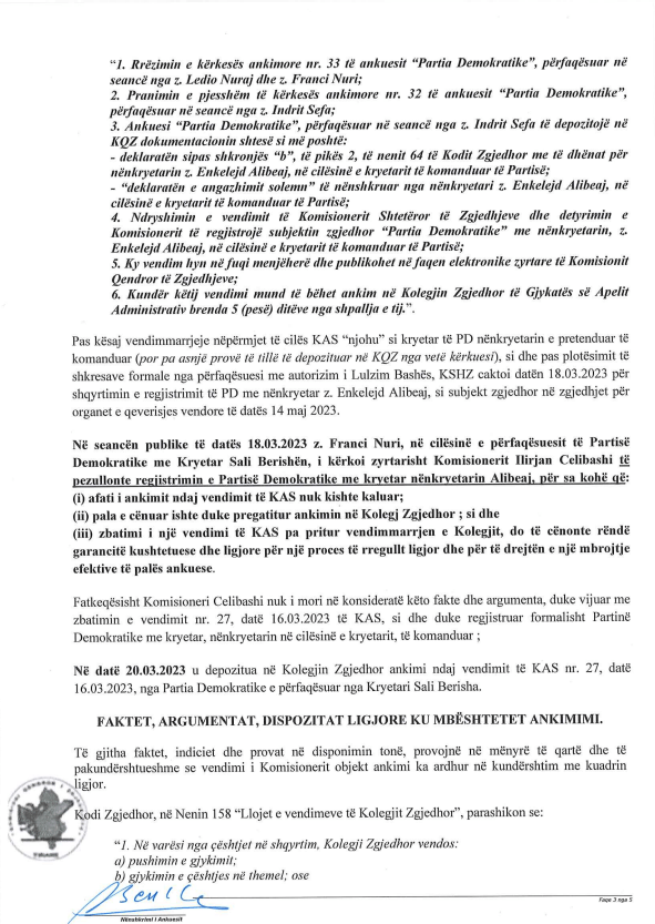 Në dokumentin e dorëzuar kërkohet “pezullimi i regjistrimit të PD deri në momentin që Kolegji Zgjedhor të jetë shprehur me një vendim përfundimtar në lidhje me ankimimin të dorëzuar nga Partia Demokratike e Shqipërisë e përfaqësuar nga kryetari Sali Berisha.”