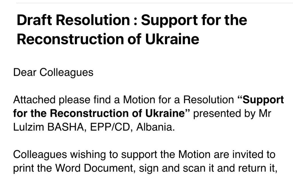 “Bashkëngjitur gjeni një Mocion për një Rezolutë “Mbështetje për Rindërtimin e Ukrainës” paraqitur nga Z. Lulzim BASHA, EPP/CD, Shqipëri.