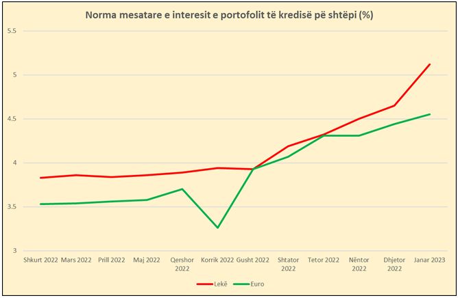 Në muajin janar, norma mesatare e interesit për kreditë për blerje banese në lekë ka arritur në 5.12%, nga 3.83% që kishte qenë në shkurt të vitit të kaluar, para se Banka e Shqipërisë të fillonte serinë e rritjes së normës bazë të interesit.