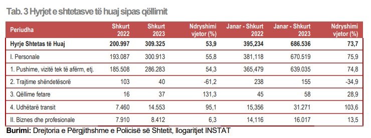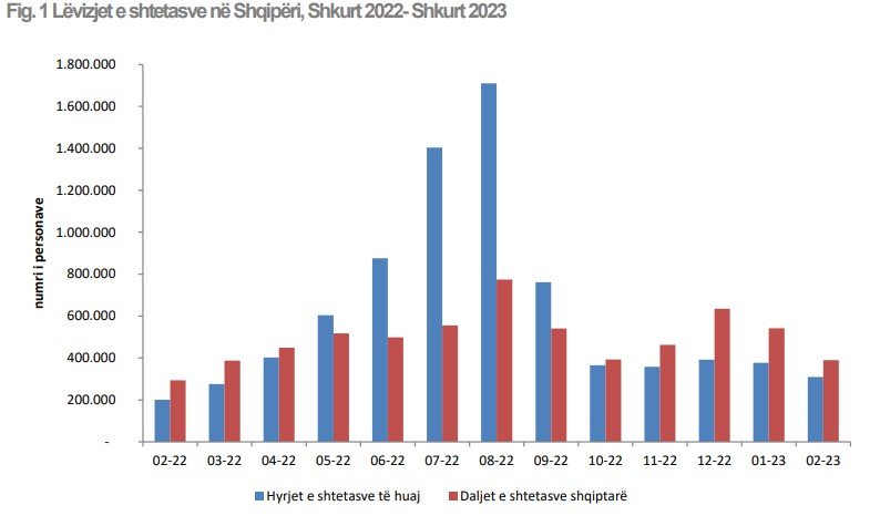 “Hyrjet e shtetasve shqiptarë dhe të huaj në territorin shqiptar, në muajin Shkurt 2023, janë 695.246. Ky tregues rezulton me një rritje 51,5%, krahasuar me Shkurt 2022. Daljet e shtetasve shqiptarë dhe të huaj nga territori i Shqipërisë, gjatë muajit Shkurt 2023, janë 693.021, duke shënuar një rritje me 40,3%, krahasuar me të njëjtën periudhë të një viti më parë.