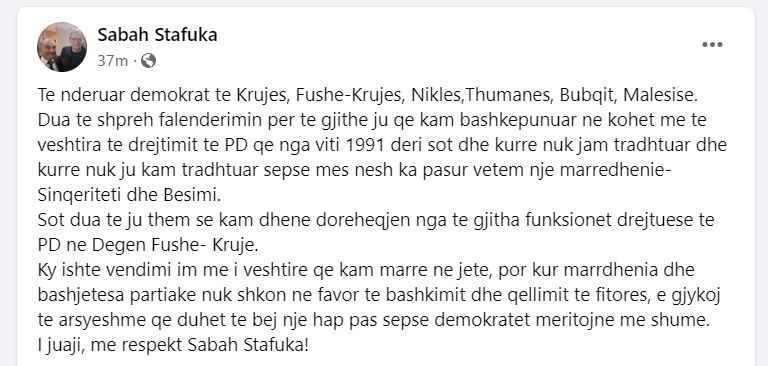 “Të nderuar demokratë të Krujës, Fushë-Krujës, Niklës, Thumanës, Bubqit, Malësisë. Dua të shpreh falënderimin për të gjithë ju që kam bashkëpunuar në kohet më të vështira të drejtimit të PD që nga viti 1991 deri sot dhe kurrë nuk jam tradhtuar dhe kurrë nuk ju kam tradhtuar sepse mes nesh ka pasur vetëm një marrëdhënie sinqeriteti dhe besimi. Sot dua t’ju them se kam dhënë dorëheqjen nga të gjitha funksionet drejtuese të PD në Degën Fushë-Krujë. Ky ishte vendimi im më i vështirë që kam marrë në jetë, por kur marrëdhënia dhe bashkëjetesa partiake nuk shkon në favor të bashkimit dhe qëllimit të fitores, e gjykoj të arsyeshme që duhet të bëjë një hap pas sepse demokratët meritojnë me shumë. I juaji, me respekt Sabah Stafuka.” – ka shkruar Stafuka në Facebook.