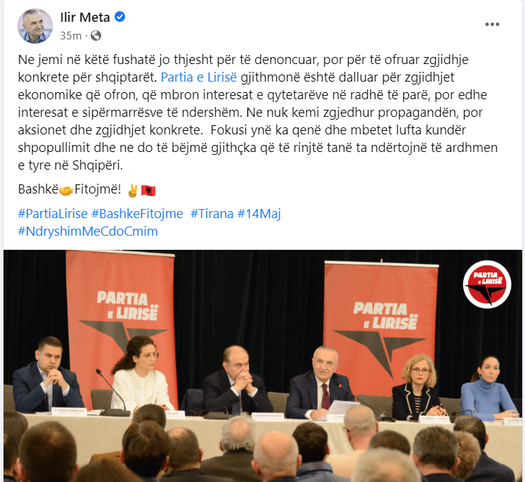 “Ne jemi në këtë fushatë jo thjesht për të denoncuar, por për të ofruar zgjidhje konkrete për shqiptarët. Partia e Lirisë gjithmonë është dalluar për zgjidhjet ekonomike që ofron, që mbron interesat e qytetarëve në radhë të parë, por edhe interesat e sipërmarrësve të ndershëm. Ne nuk kemi zgjedhur propagandën, por aksionet dhe zgjidhjet konkrete. Fokusi ynë ka qenë dhe mbetet lufta kundër shpopullimit dhe ne do të bëjmë gjithçka që të rinjtë tanë ta ndërtojnë të ardhmen e tyre në Shqipëri. Bashkë Fitojmë! Partia e Lirise, Bashke Fitojme, Tirana 14 Maj, Ndryshim Me Cdo Cmim.” – shkruan Meta.
