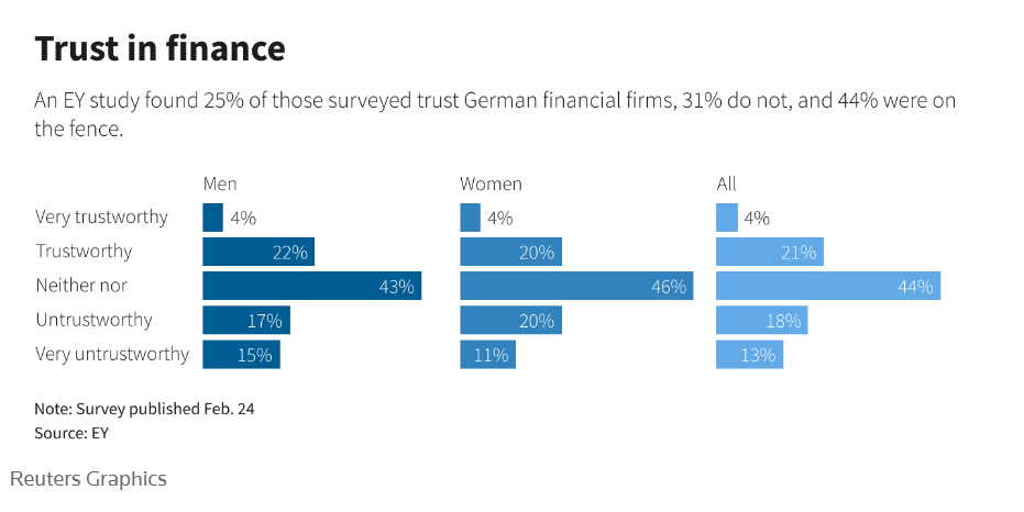 Një studim i këtij viti nga EY zbuloi se 25% e të anketuarve në Gjermani u besojnë firmave financiare, 31% nuk u besojnë dhe 44% janë të pavendosur.