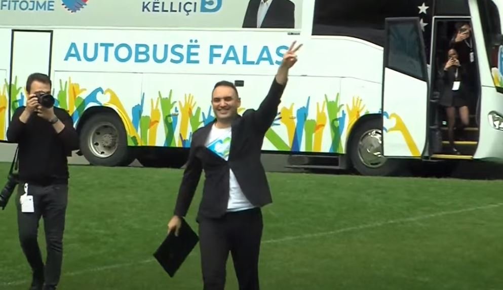 Këlliçi u fut me autobus në stadiumin “Air Albania” me mbishkrimin “autobusë falas” premtimin e tij kryesor me të cilin kërkon të fitojë Bashkinë e Tiranës.