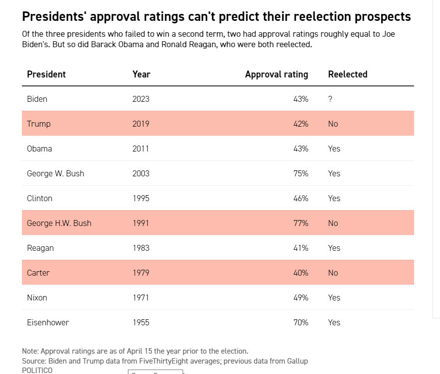 Por për të nënvizuar se si gjërat mund të ndryshojnë midis mesit të prillit të vitit para zgjedhjeve dhe nëntorit të ardhshëm, si George H.W. Bush dhe djali i tij, George W. Bush, kishin vlerësime të larta të miratimit në këtë pikë. George H.W. Bush u hoq vetëm disa muaj nga operacioni i suksesshëm ‘Stuhia e Shkretëtirës’ dhe kishte një vlerësim prej 77 për qind në mes të prillit, sipas Gallup, i cili ruan arkivat më të thella të vlerësimeve të të presidencave.