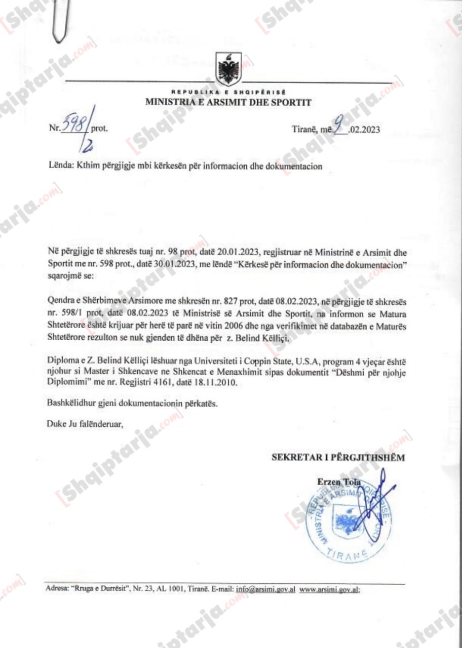 Të njëjtin fakt, pra që Këlliçi nuk është pajisur kurrë me diplomën e shkollës së mesme, e konfirmon edhe Ministria e Arsimit, të cilës iu drejtuam zyrtarisht dhe morëm përgjigje me një shkresë (kopje të së cilës e disponojmë), e cila shprehet se në rregjistrat e maturës shtetërore nuk gjendet emri i Këlliçit.