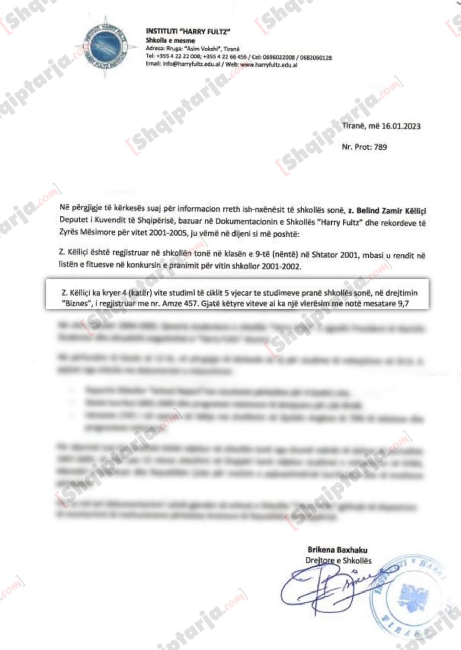 Për t’ju përgjigjur këtyre pyetjeve, iu drejtuam fillimisht Institutit “Harry Fultz”, e cila në përgjigjen e saj zyrtare, që mban datën 16 janar 2023 (dokument kopje të të cilit e disponojmë), konfirmon se Belind Këlliçi ka përfunduar vetëm 4 vite studime nga cikli 5 vjeçar i Degës Biznes, duke vërtetuar faktin se ai nuk e ka përfunduar shkollën e mesme (nivelin 4 të kualifikimit) dhe nuk është diplomuar për programin e studimit përkatës. Pra, nuk disponon një diplomë që vërteton përfundimin e shkollës së mesme.
