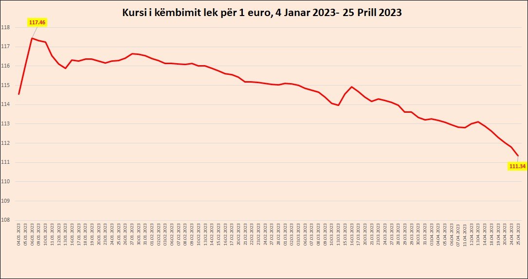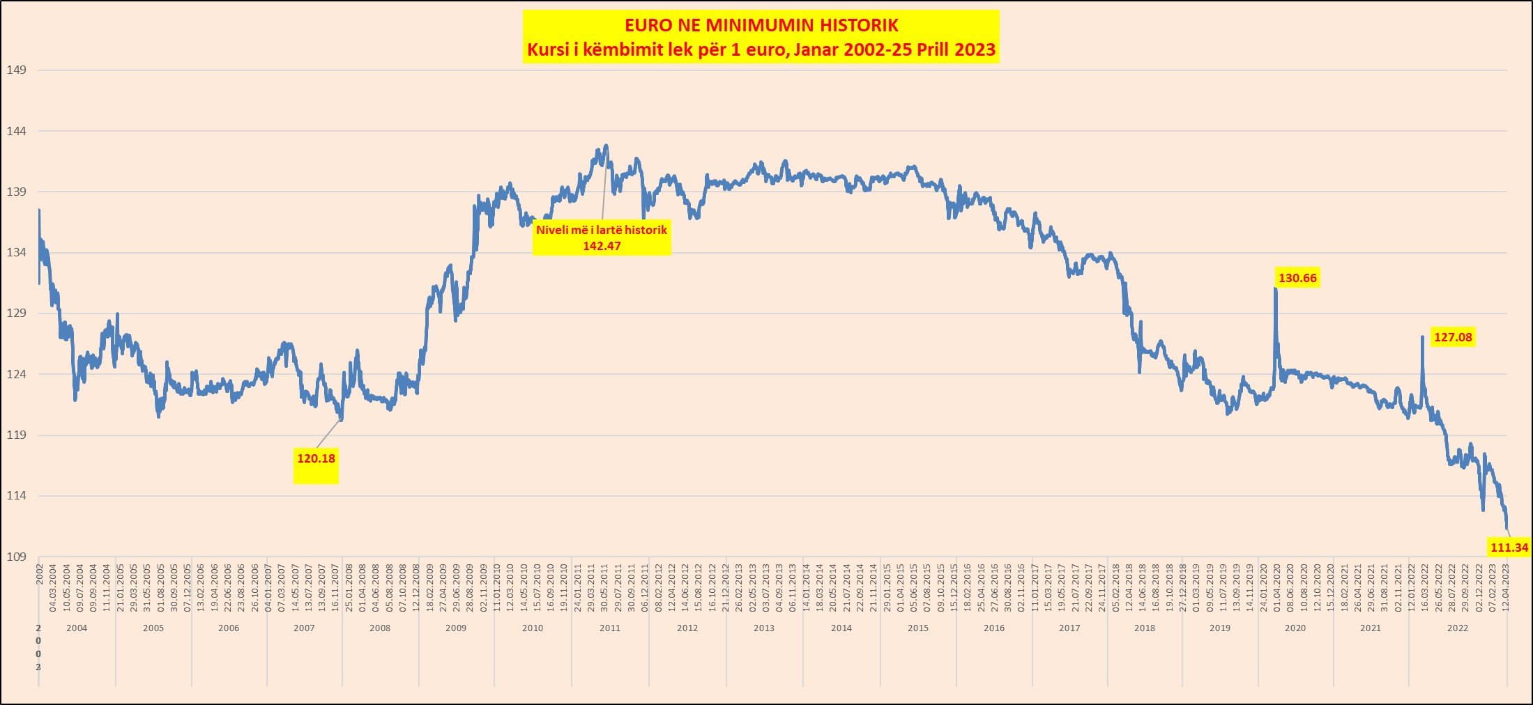 Sipas kursit zyrtar të këmbimit të Bankës së Shqipërisë, euro u këmbye me 111.34 lekë, në rënie me 0.47 pikë krahasuar me ditën e hënë dhe duke prekur një minimum të ri historik.