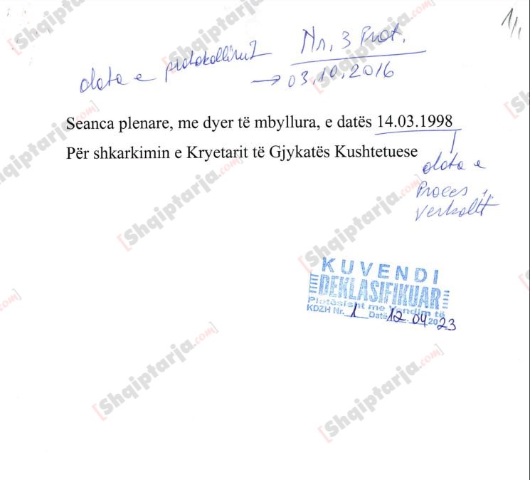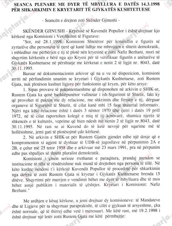 Kuvendi i Shqipërisë ka deklasifikuar pas 25 vitesh dokumentimin e seancës plenare të 14 marsit 1998, me objekt shkarkimin e kryetarit të Gjykatës Kushtetuese, Rustem Gjata, babai i Çlirim Gjatës, ish kandidat për deputet i Partisë Demokratike. Në hyrje të procesverbalit të seancës me dyer të mbyllura, mbajtur sekret për 25 vite, thuhet se Rustem Gjata, i emëruar nga PD-ja e Sali Berishës anëtar i Gjykatës Kushtetuese, kishte qenë bashkëpunëtor vullnetar i ish Sigurimit të Shtetit, fakt që provohej nga dy relacione të shkruara dhe të firmosura nga Gjata, ku raportonte kundër shokëve të tij kosovarë, shumica njerëz të shkencës dhe kulturës.