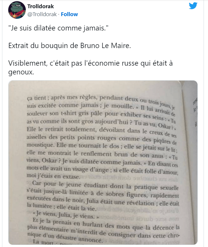 Ndërsa disa po e tallën Le Maire për prozën ‘e nxehtë’, të tjerë vunë në dyshim nëse preferencat e tij letrare e pengonin punën e tij të tanishme. Ministri i financave nuk duhet të ketë ‘një minutë, një orë, një javë nga koha e tij për t’i kushtuar shkrimit të një libri’ ndërsa publiku francez po përpiqej të përballej me inflacionin, ka argumentuar deputeti i opozitës Francois Ruffin i La France Insoumise.