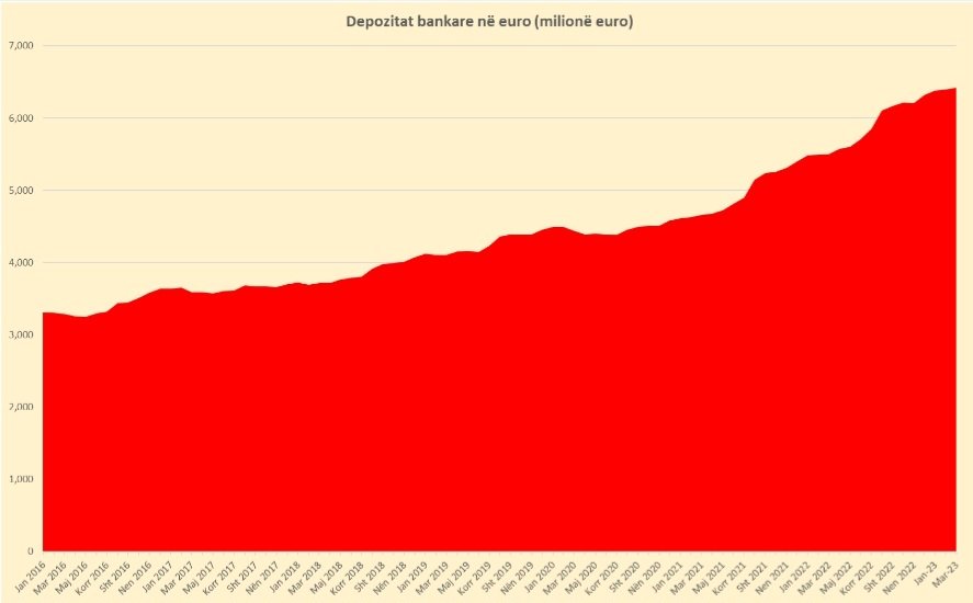 Sipas të dhënave nga Banka e Shqipërisë, në fund të tremujorit i 2023 totali i depozitave bankare në monedhën europiane arriti në 6.42 miliardë euro.