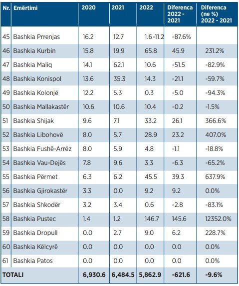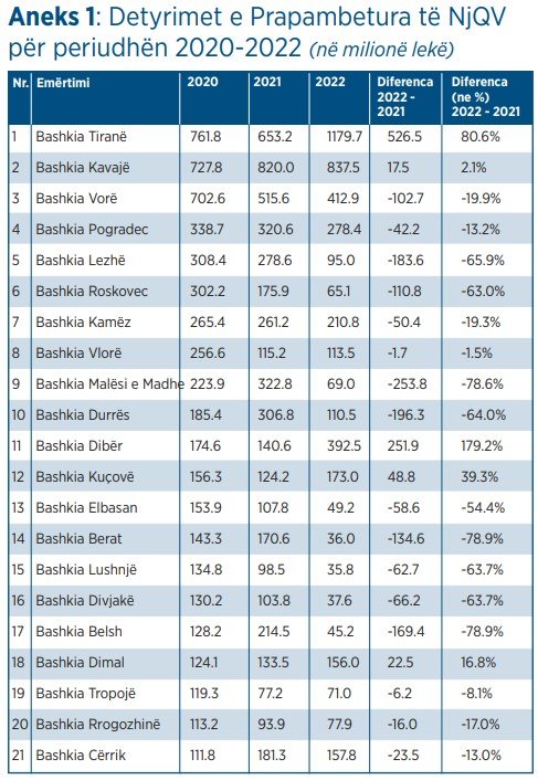 Referuar të dhënave të raportit 14 bashkitë me rritje të detyrimeve të prapambetura janë: në bashkinë Tiranë për vitin 2022 detyrimet e prapambetura u rritën 80,6% krahasuar me 2021, në Përmet 637%, në Libohovë 407%, në Shijak rreth 367%, Dropull 228%, në Kurbin 231%, në Dibër u rritën rreth 180%, në Devoll rreth 124%, Në Pustec 121,2%, në Peqin rreth 62%, në Kuçovë 39,3%, në Urën Vajgurore 16,8%, në Selenicë 13,3% dhe në Kavajë 2,1%.