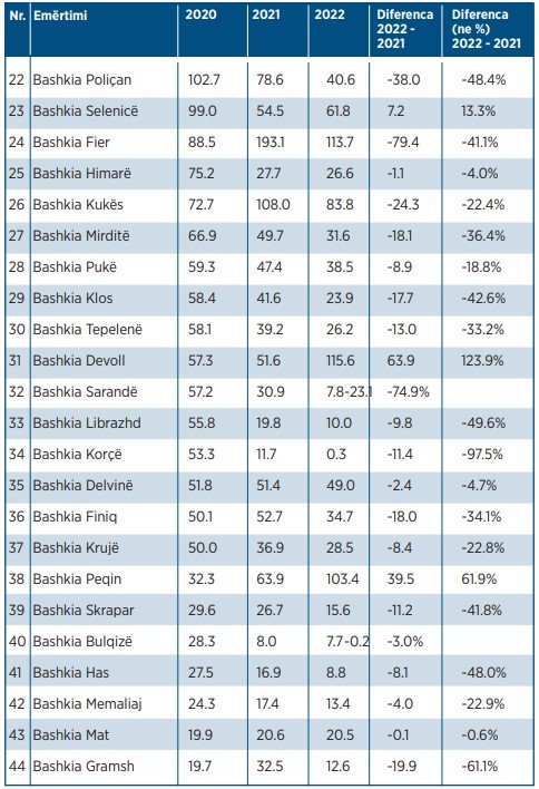 Në total për 2022 nga 61 bashkitë e vendit, vetëm 43 prej tyre rezultojnë pa probleme financiare, kurse 1 bashki është në pamundësi pagese, 9 prej tyre janë në vështirësi financiare, ndërsa 8 bashki janë me probleme financiare.