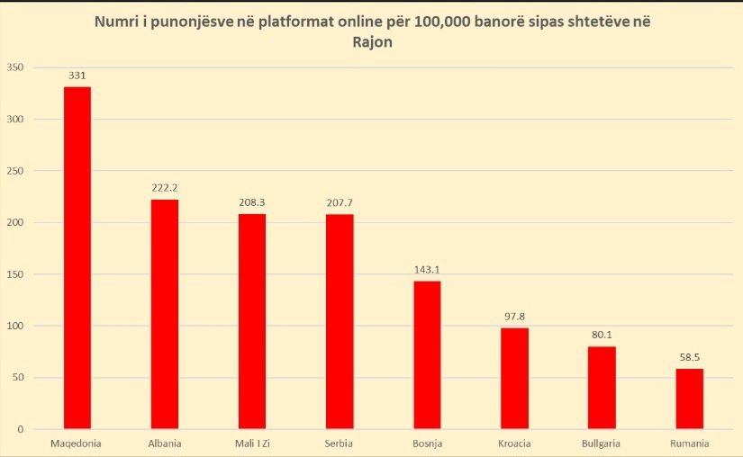 Numrin më të lartë të punonjësve online në raport me popullsinë e saj e kishte Maqedonia e Veriut me 331 punonjës për 100,000 banorë, Shqipëria me 222,2 të punësuar për 100,000 banorë, Mali i Zi me 208.3, Serbia me 207.7, Bosnja me 143.1, Kroacia me 97.8, Bullgaria me 80.1 dhe Rumania me 58.5.