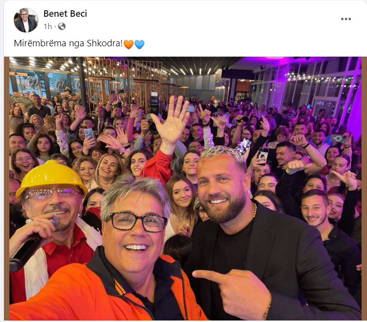 Në foton e hedhur në Facebook nga Beci, shfaqet edhe këngëtari i njohur shkodran Frederik Ndoci me një kaskë minatori në kokë.