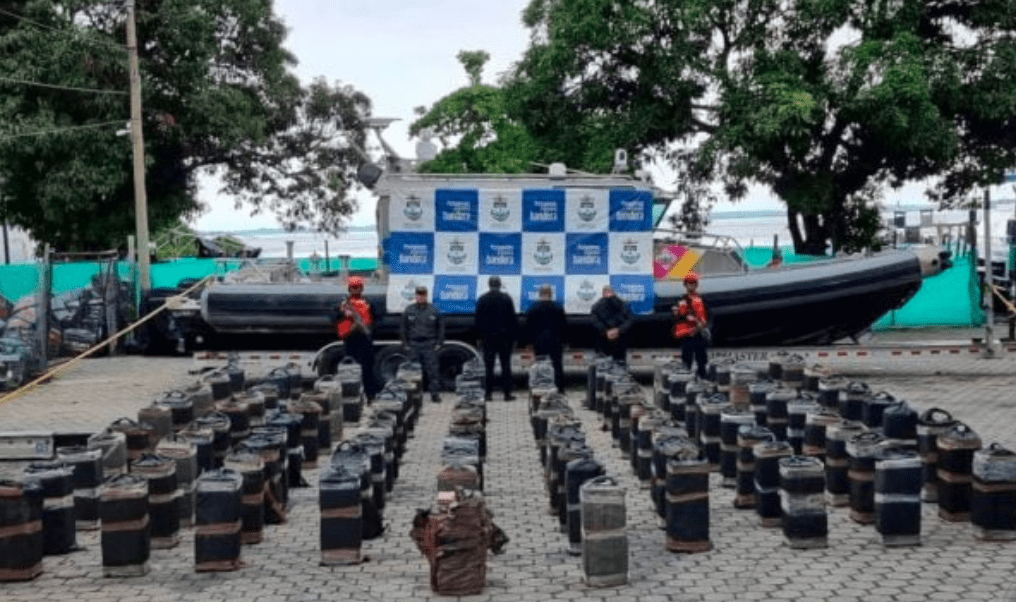 Në fotot e publikuara nga autoritetet kolumbiane, shihet varka në ujë dhe ngarkesa me drogë e shkarkuar pranë portit.