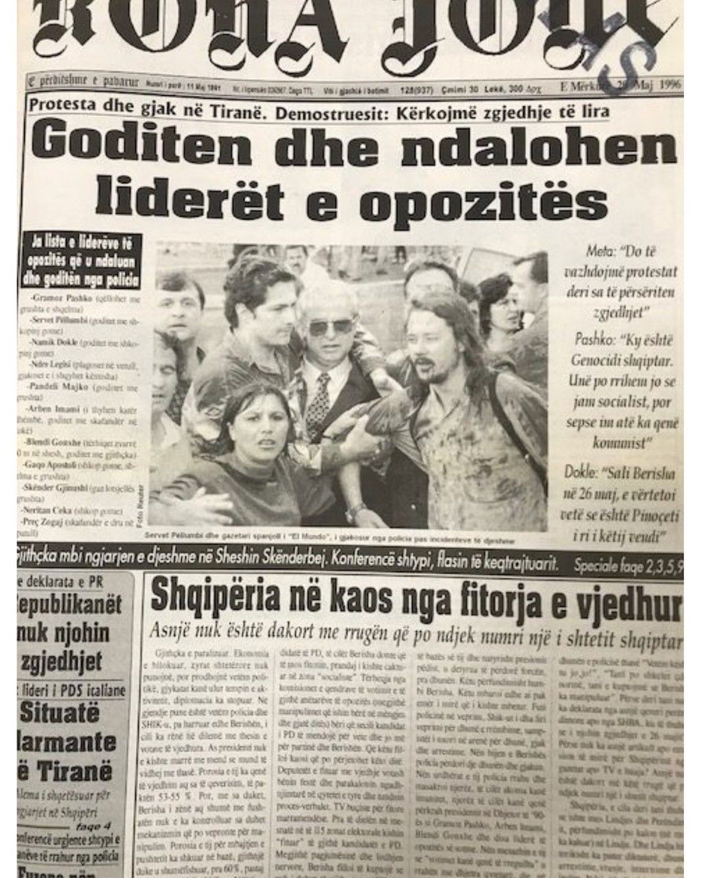 Në 28 maj të vitit 1996, krerët e opozitës si Servet Pëllumbi, Gaqo Apostoli, Neritan Ceka, Paskal Milo, Ndre Legisi, Namik Dokle, Pandeli Majko, Blendi Gonxhe, Kastriot Islami etj., u dhunuan barbarisht nga policia dhe SHIK-u në Sheshin Skënderbeu, ku kishin dalë për të protestuar. Janë dhunuar gjithashtu Arta Dade, Ermelinda Meksi dhe Skënder Gjinushi. Janë dhunuar në mënyrë çnjerëzore Edi Rama, Erion Braçe, Preç Zogaj, Abren Imami, Perekli Teta, ndërsa gazetari Bardhok Lala është lënë për të vdekur tek Liqeni Artificial.