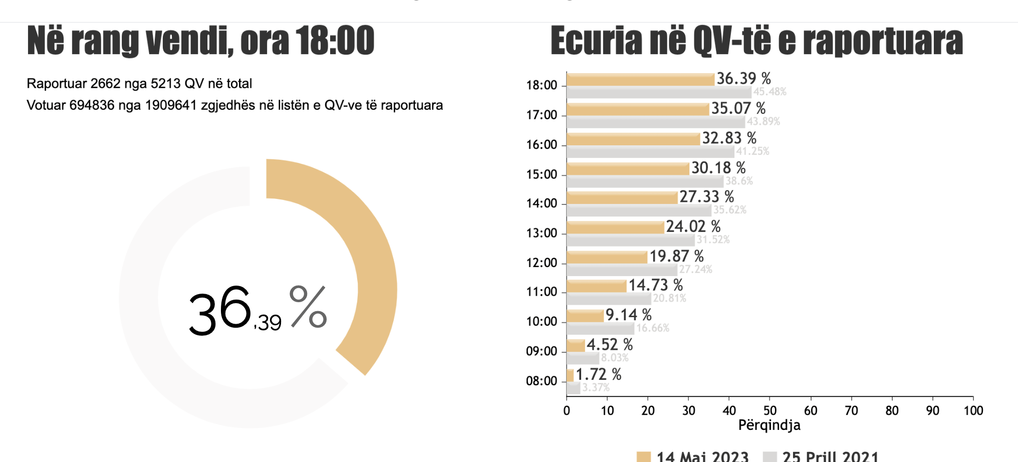 Deri në orën 18:00 pjesëmarrja sipas KQZ-së ka qenë 36.39 % në rang vendi për 2662 nga 5213 qendra votimi.