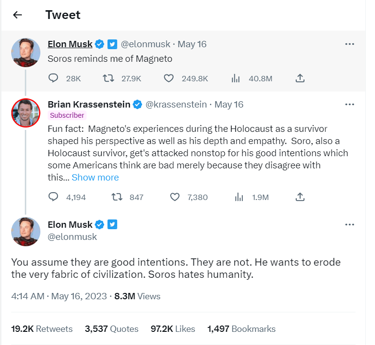 Musk shtjelloi Sorosin kur iu bë presion nga gazetari Brian Krassenstein, i cili pretendoi se biznesmeni hungaro-amerikan ishte një ‘thes boksi’ i shpeshtë nga krahu i djathtë, sepse disa njerëz kundërshtojnë ‘qëllimet e mira’ të tij pasi ‘ata nuk pajtohen me përkatësitë e tij politike’.