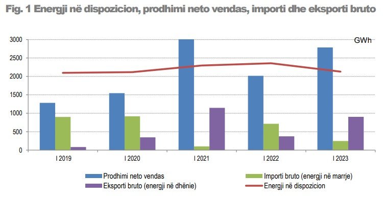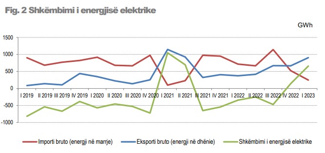 Importi bruto i energjisë elektrike (energji në marrje), në tremujorin e parë të vitit 2023, arriti vlerën 246 GWh nga 715 GWh që ishte në të njëjtën periudhë të një viti më parë, duke shënuar kështu një ulje me 2,9 herë. Eksporti bruto i energjisë elektrike (energji në dhënie) arriti vlerën 904 GWh nga 373 GWh, duke shënuar një rritje me 2,4 herë.
