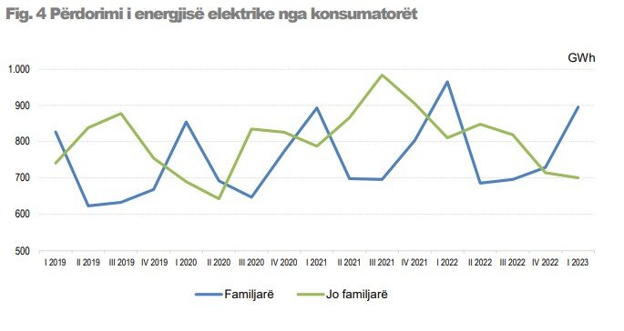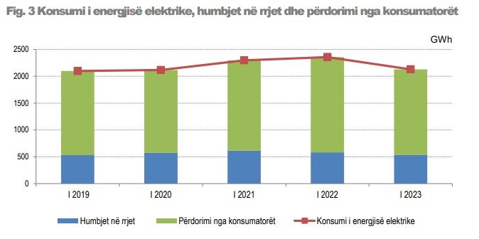 Si rrjedhojë, përdorimi i energjisë elektrike nga konsumatorët, në tremujorin e parë të vitit 2023, u ul me 10,1%, duke arritur vlerën 1.595 GWh nga 1.775 GWh që ishte në tremujorin e parë të vitit 2022.