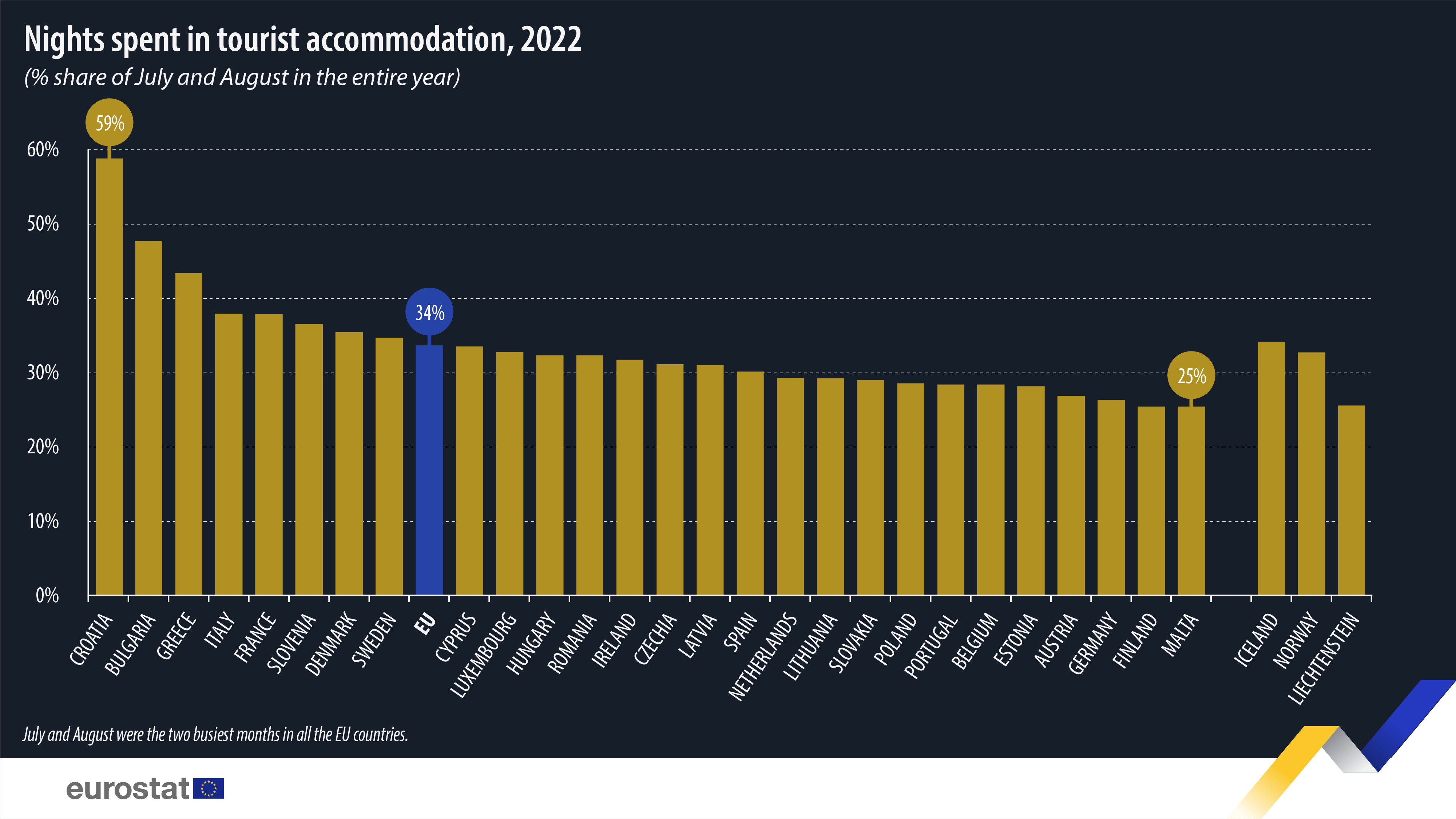 Muajt e pikut për netët e kaluara, ishin korriku dhe gushti në të gjitha vendet e BE-së në vitin 2022. Modeli sezonal ishte më i theksuar në Kroaci (59% e netëve të kaluara në 2022), Bullgari (48%) dhe Greqi (43%).