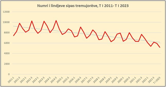 Nga mesatarisht 8-10 mijë lindje në tremujor që kishte në vitin 2011, në vitin 2022 për herë të parë treguesi ra nën 6 mijë lindje në 2022, duke u reduktuar më tej afër 5 mijë në muajt e parë të këtij viti (shiko grafikun: Numri i lindjeve sipas tremujorëve, T I 2011- T I 2023).