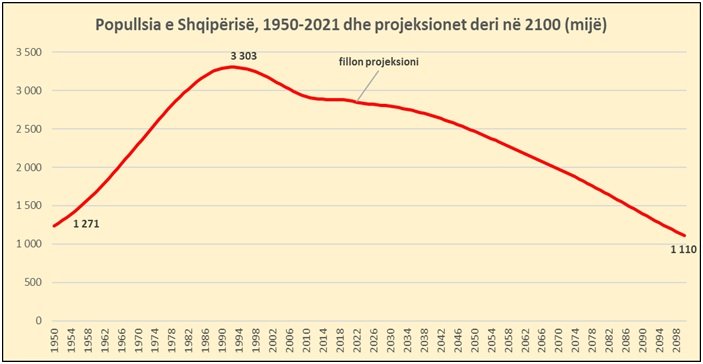 Kombet e Bashkuara presin që popullsia totale banuese në vend, në vitin 2100, sipas variantit mesatar, do të zbresë në 1.1 milionë banorë (shiko grafikun: Popullsia e Shqipërisë 1990-2021 dhe projeksioni 2022-2100)./ O.Liperi
