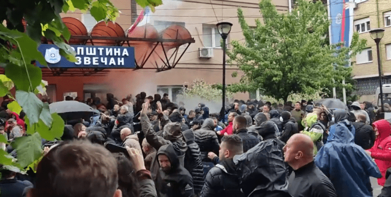 Policia e Kosovës përdori gaz lotsjellës dhe shok-bomba për t’i shpërndarë qytetarët e tubuar para objektit komunal në Zveçan – komunë e banuar me shumicë serbe në pjesën veriore të vendit.