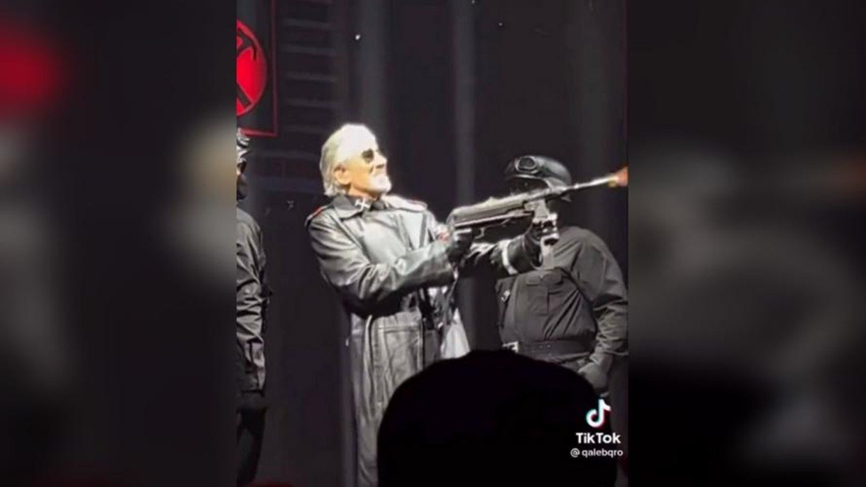 Në pamjet e postuara në rrjetet sociale, muzikanti shihet i veshur me një pallto lëkure që i ngjan një uniforme naziste me dy çekanë të kryqëzuar dhe një shirit të kuq. Më pas ai merr një armë lodër dhe ia drejton turmës së ekzaltuar.