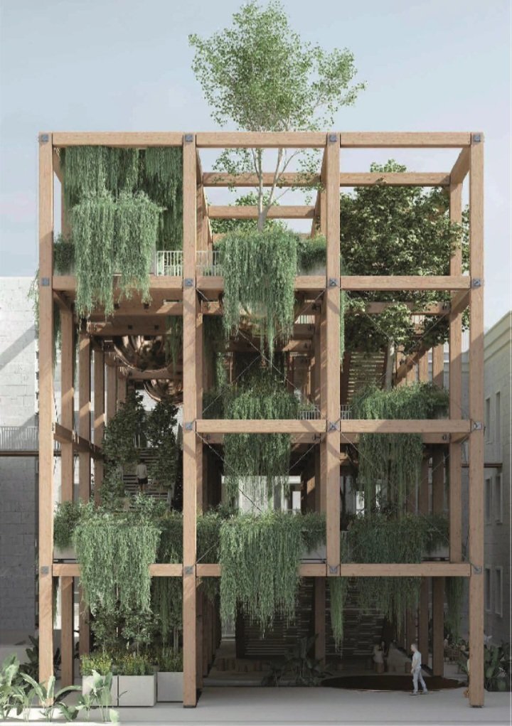 Edeni qëndron në një rrjetë 4800x4800x4800mm. Trarët prej druri të ndërthurur kryq përbëjnë një kornizë modulare kubike 6x3x4, që shërben si strukturë. Konstruksioni i drurit të parafabrikuar do të garantojë zbatim të saktë, bashkim të shpejtë në vendndodhje dhe emëton vlera të ulëta të karbonit në krahasim me materialet konstruktive tradicionale, siç janë betoni dhe çeliku” thuhet në dokument./N.Maho
