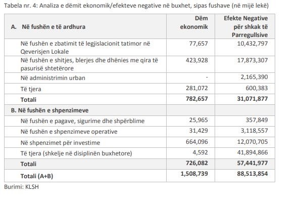 Sipas llogaritjeve të bëra nga institucioni suprem i auditit, këto parregullsi kanë pasur efekt negativ prej 88.5 miliardë lekësh, apo 756 milionë euro. Në total dëmi nga këto dy elemente është rreth 770 milionë euro.