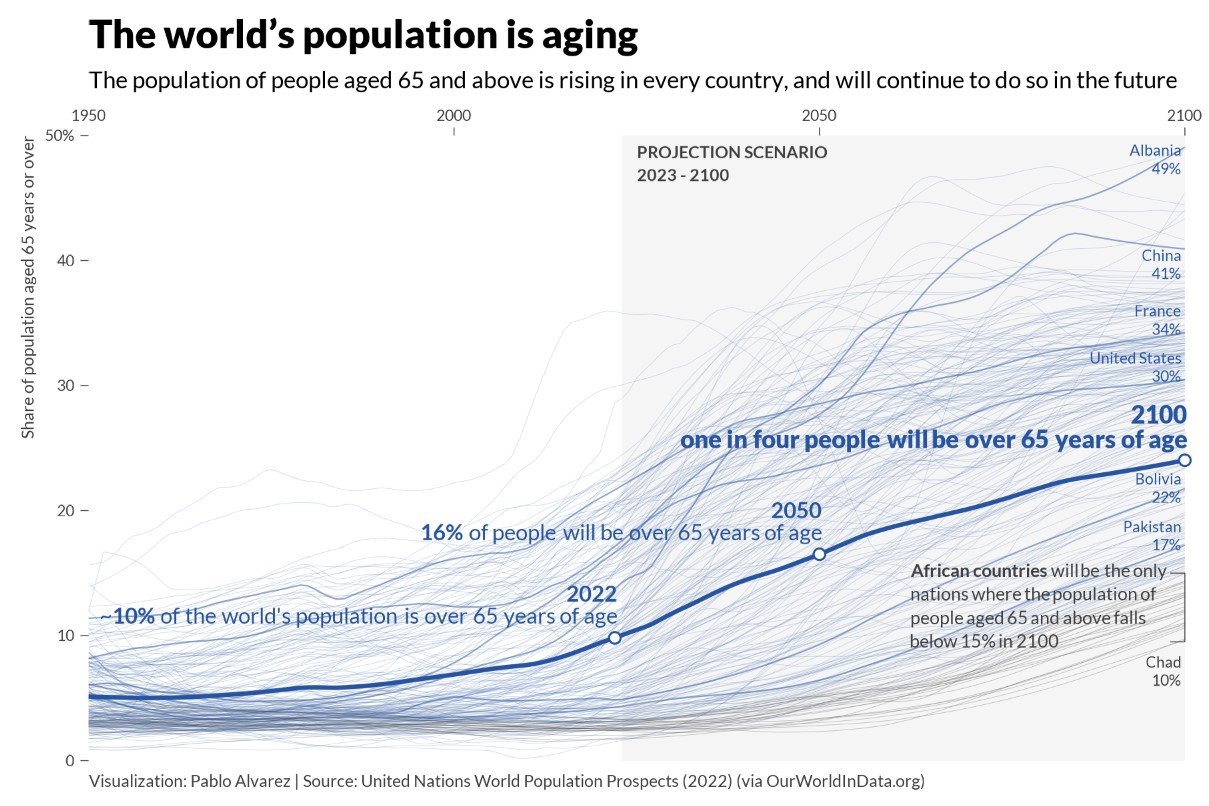 Grafiku i publikuar nga Visual Capitalist (shiko në fund) përdor të dhëna nga parashikimet e Popullsisë Globale nga Kombet e Bashkuara për të dhënë rritjen e popullsisë së moshuar në botë.