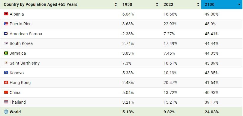Deri në vitin 2100, një sërë vendesh aziatike dhe kombesh ishullore, që përballen me rritje të ulët të popullsisë, pritet të kenë më shumë se një të tretën e popullsisë së tyre në moshën 65 vjeç ose më të vjetër, duke përfshirë Korenë e Jugut dhe Xhamajkën, me 44%.