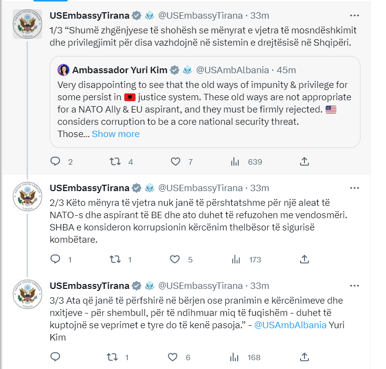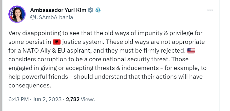 “Shumë zhgënjyese të shohësh se mënyrat e vjetra të mosndëshkimit dhe privilegjimit për disa vazhdojnë në sistemin e drejtësisë. Këto mënyra të vjetra nuk janë të përshtatshme për një aleat të NATO-s dhe aspirantëve të BE-së dhe ato duhet të refuzohen me vendosmëri. SHBA konsideron korrupsionin si një kërcënim thelbësor të sigurisë kombëtare. Ata që merren me dhënien ose pranimin e kërcënimeve dhe nxitjeve – për shembull, për të ndihmuar miqtë e fuqishëm – duhet të kuptojnë se veprimet e tyre do të kenë pasoja.” – shkruan Kim në Twitter.